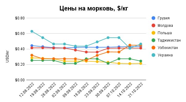 "В Україні, попри активні темпи жнив, морква, навпаки, піднялася в ціні до $0,46/кг через ажіотажний попит на цю продукцію з боку власників овочесховищ. До того ж самі фермери, сподіваючись на стрімке зростання цін у другій половині сезону, не поспішали зі збутом і не форсували поточний продаж моркви", - зазначили експерти.