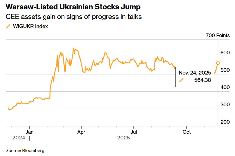 Перспективи мирної угоди в Україні починають проявлятися у валютах. Так, злотий, форинт і крона до кінця дня торгів підскочили на 0,2–0,4% щодо євровалюти, акції зросли в Будапешті та Празі. Також індекс українських компаній, що котируються на Варшавській фондовій біржі, підскочив найбільше з серпня.
