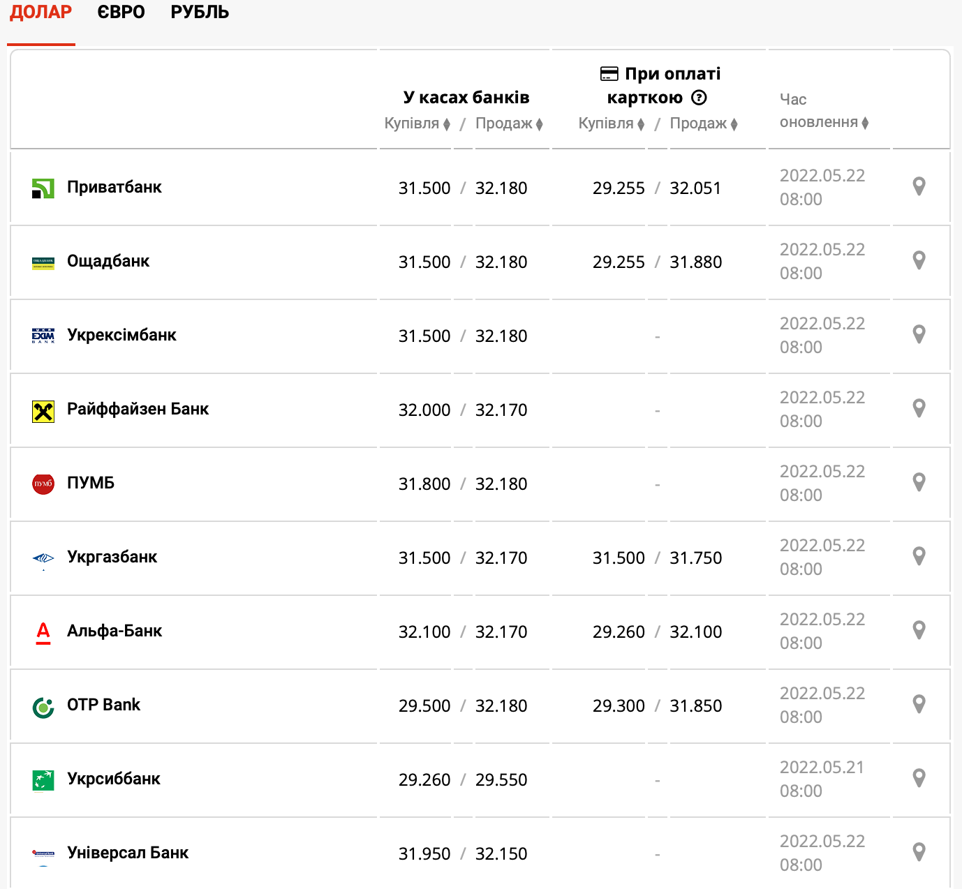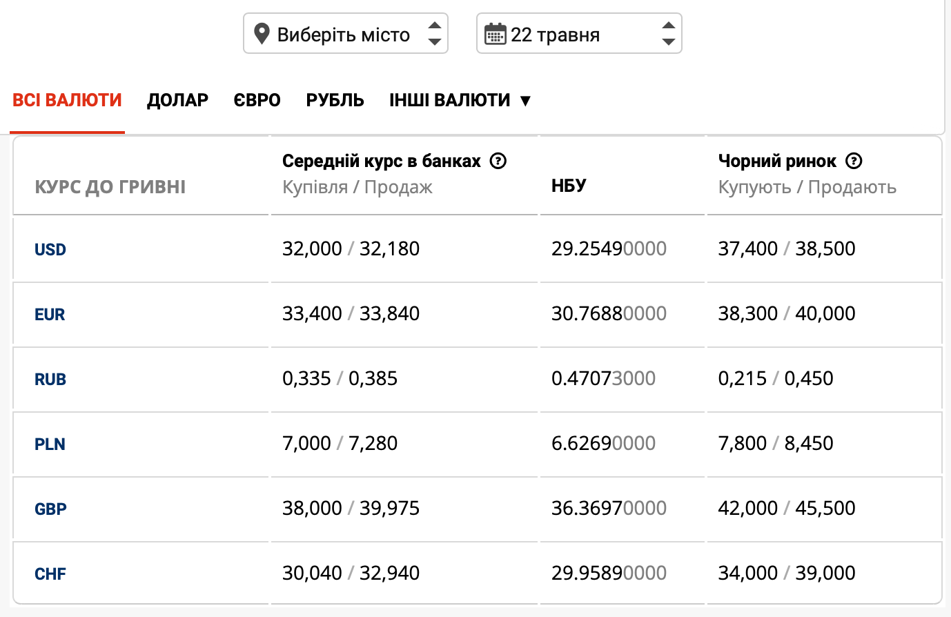 Станом на 22 травня середній курс долара до гривні на чорному ринку становить 37,4 грн/дол за купівлю та 38,5 грн/дол за продаж. Водночас у банках купляють долар за 32 гривні, а продати можуть за 32,18 грн за долар США. Офіційний курс долара до гривні залишається на рівні 29,25 грн/дол.