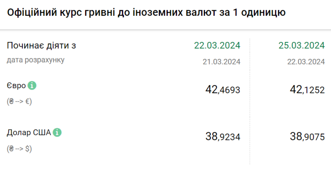 На понеділок, 25 березня, НБУ встановив офіційний курс долара на рівні 38,90 грн за долар. Водночас офіційний курс регулятора у п'ятницю становив 39,92 грн за долар. На готівковому ринку курс впав на 15 копійок, а саме 39,05 грн за один долар.