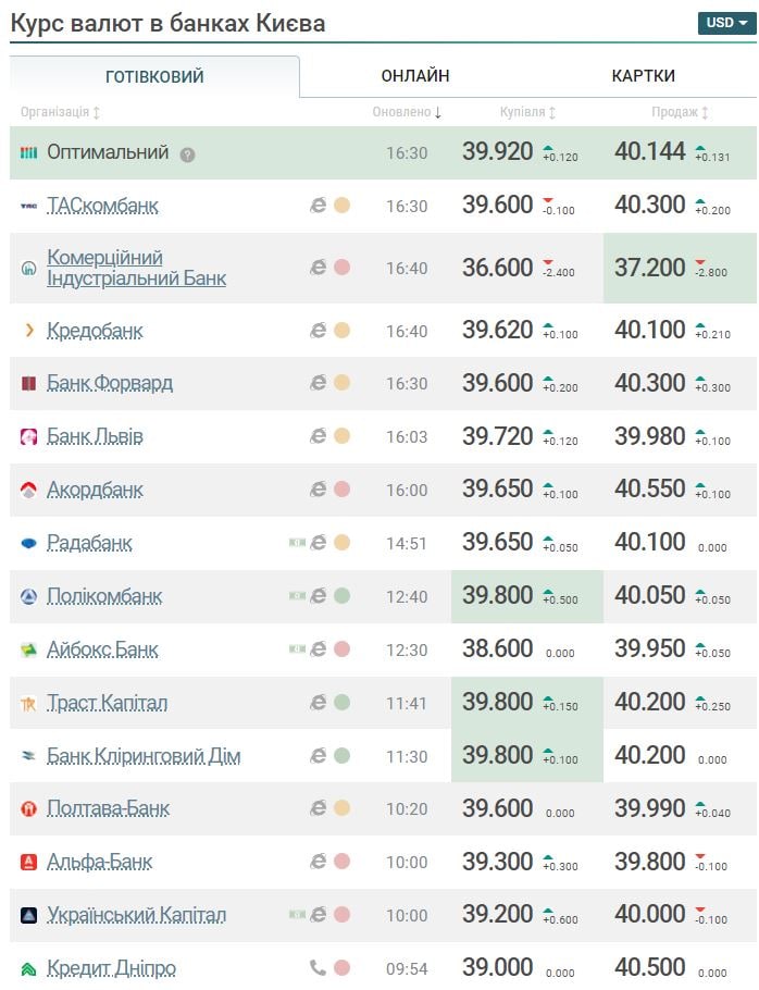 Зокрема, долар по 40 гривень і вище продають такі фінустанови: Оптимальний 40,14 гривні, ТАСкомбанк - 40,30 гривні, Кредобанк - 40,10 гривні, Банк Форвард - 40,30 гривні, Акордбанк - 40,55 гривні, Радабанк - 40,10 гривні, Полікомбанк - 40,05 гривні.