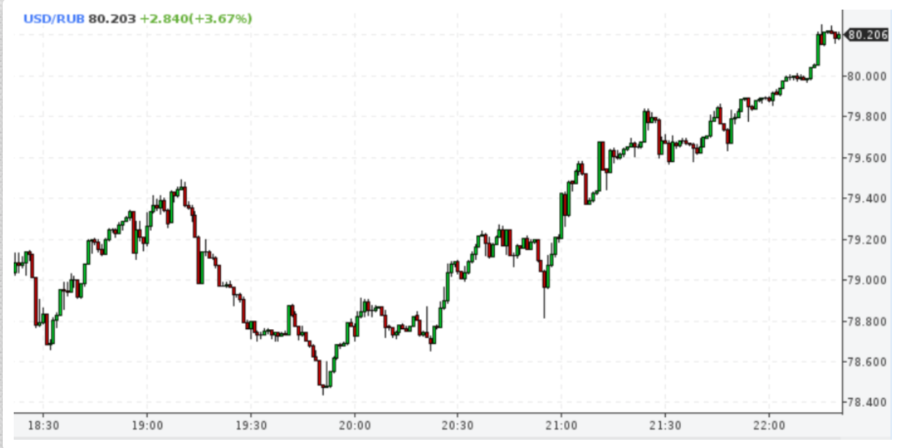 Після засідання Ради безпеки Російської Федерації, де було вирішено підписати указ про визнання так званих "ДНР" та "ЛНР" "незалежними республіками", а саме під час пропагандистського звернення Путіна до нації на Московській біржі долар перевищив позначку в 80 рублів за 1 долар США, а євро піднявся до позначки в 90 рублів.