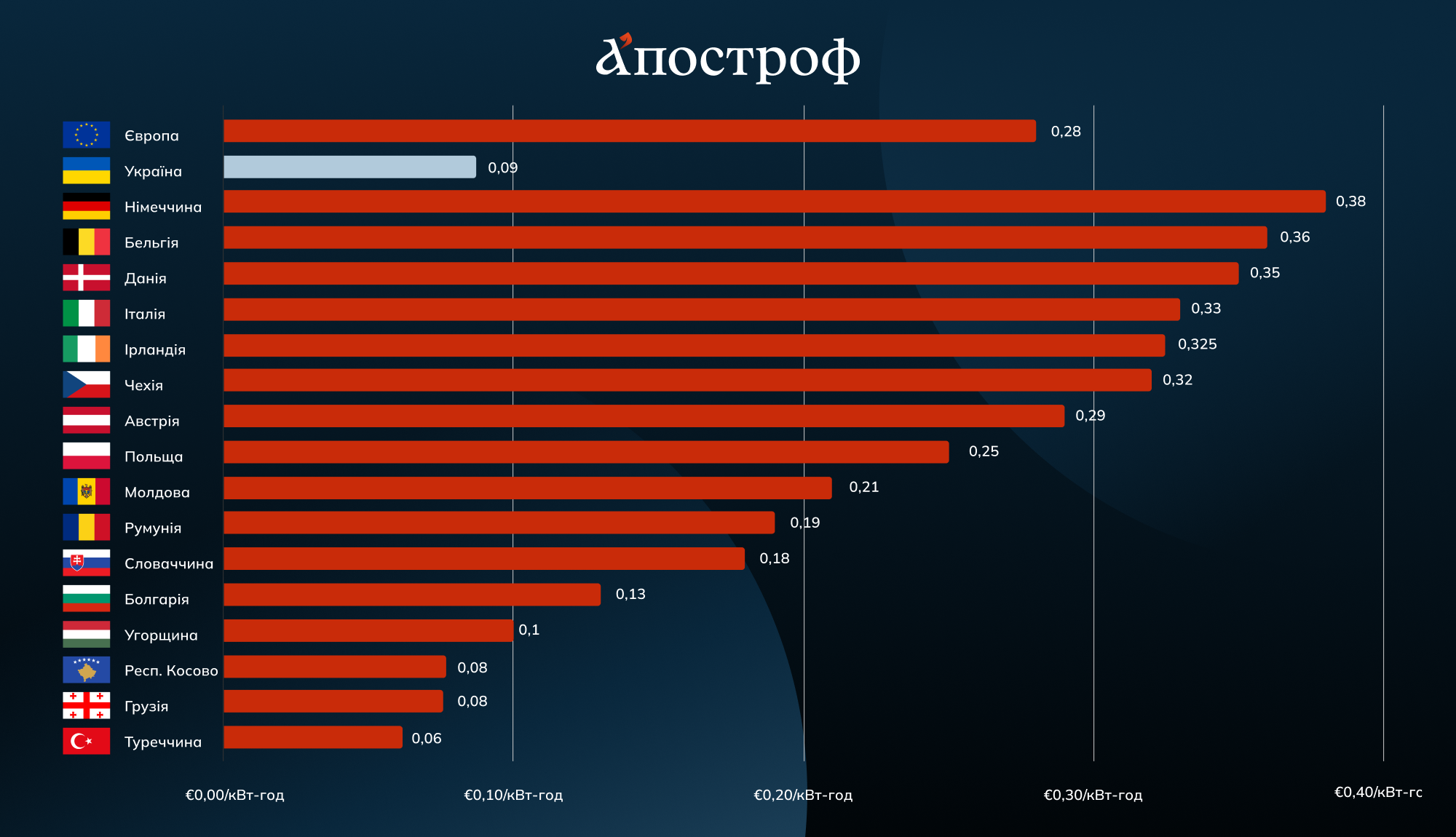 А ось у сусідніх з Україною країнах ціни суттєво нижчі. Так, у Польщі тариф становить € 0,25 за 1 кВт-год, Молдові – €0,21/кВт-год, Румунії – €0,19/кВт-год, Словаччині – €0,18/кВт-год, Болгарії – €0,13/кВт-год, Угорщині – €0,10/кВт-година.
