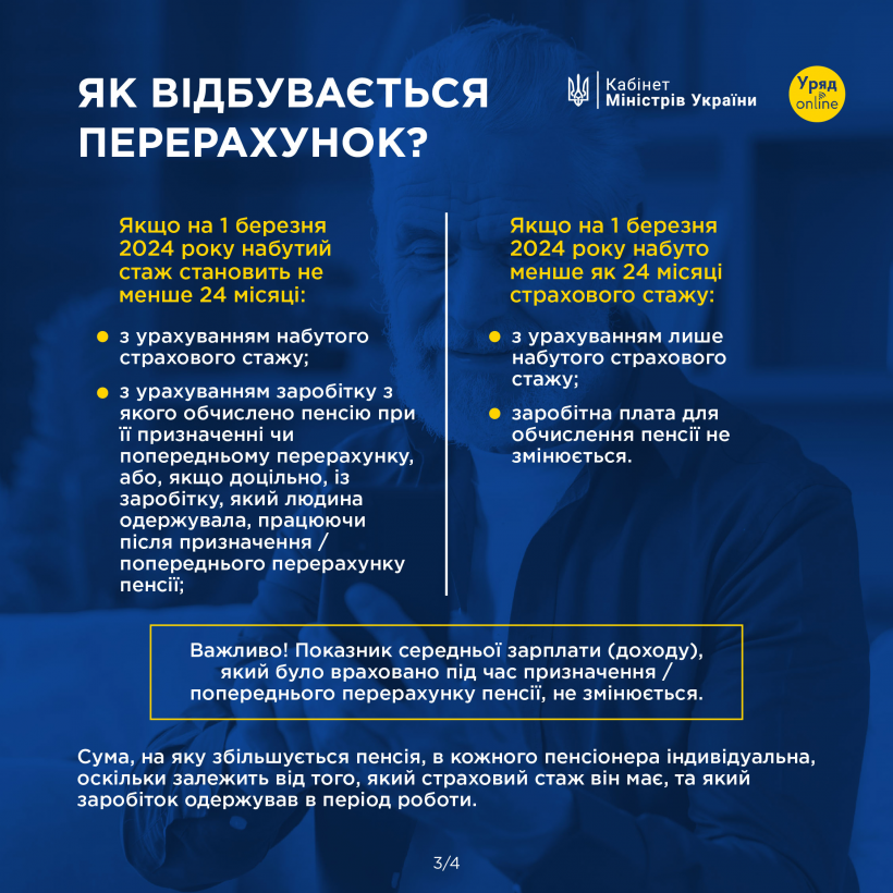 При цьому працюючим пенсіонерам, які мають пенсії за вислугою років, перерахунок проведуть виключно, якщо досягнули пенсійного віку.