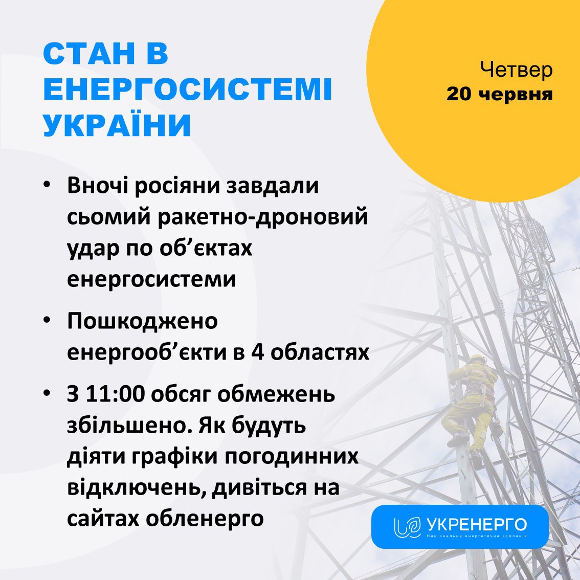Через чергову атаку росіян на енергетичні об'єкти в Україні у четвер, 20 червня, обсяг застосованих заходів обмеження споживання збільшено з 11:00.
