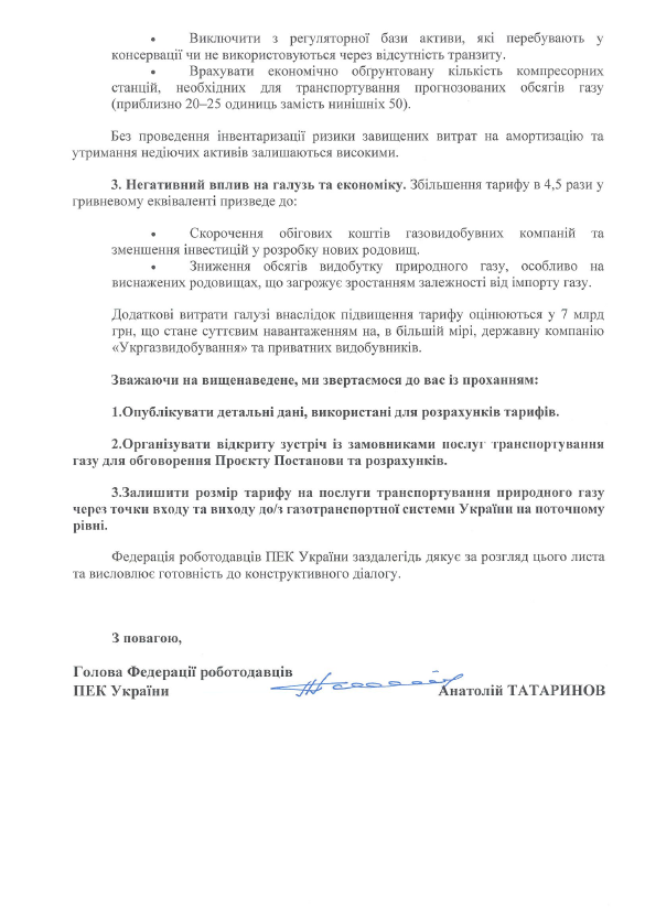 Зокрема, у Федерації підкреслили, що збільшення тарифу матиме негативний вплив на газовидобувну галузь та економіку України.