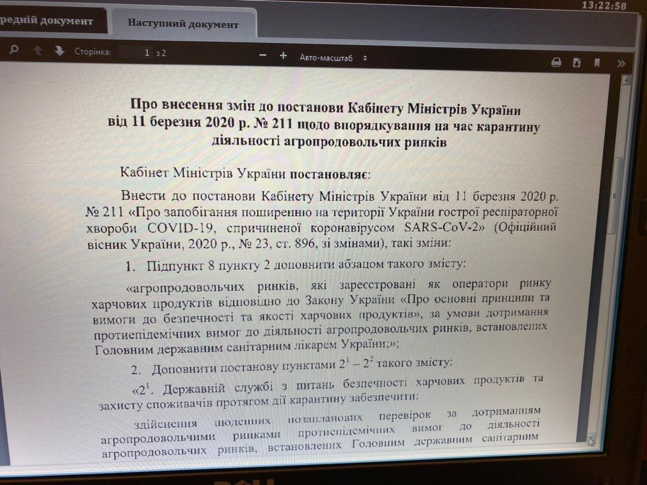 "Кабмін вніс зміни на час карантину, що стосуються діяльності агропродовольчих ринків. Тепер необхідно проводити там щоденні позапланові перевірки, також на території ринку має постійно перебувати мінімум 2 інспектори", - повідомив Гончаренко.