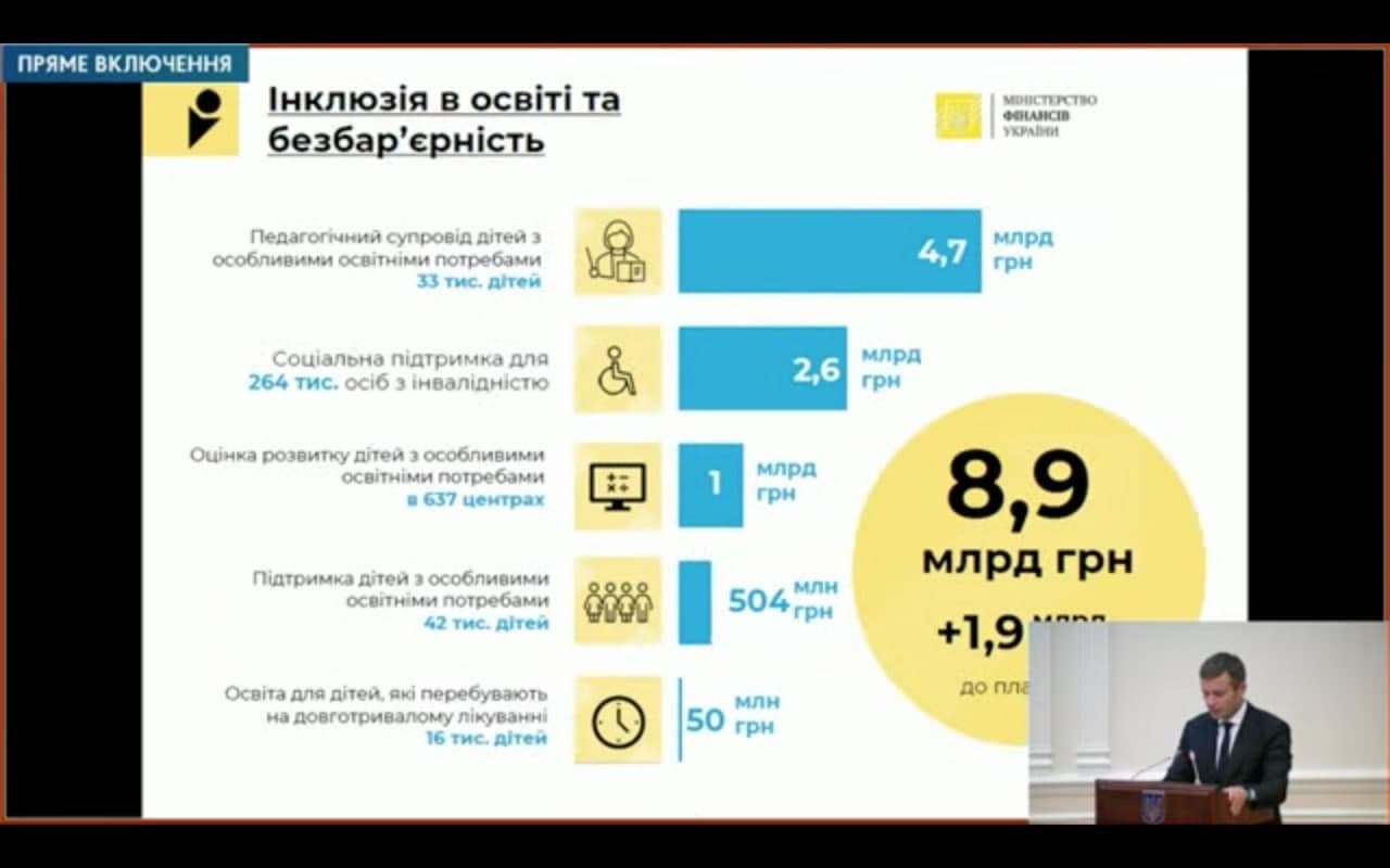 Витрати на інклюзивну освіту в порівнянні з 2021 роком зростуть на 30%, на 9,9 млрд грн збільшаться витрати на інфраструктуру.