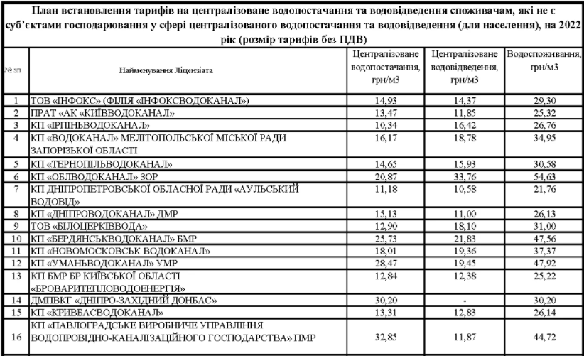 • Запоріжжя – 54,63 грн/м³ (20,8 грн/м³ та 33,76 грн/м³ за водопостачання та водовідведення відповідно);
