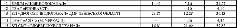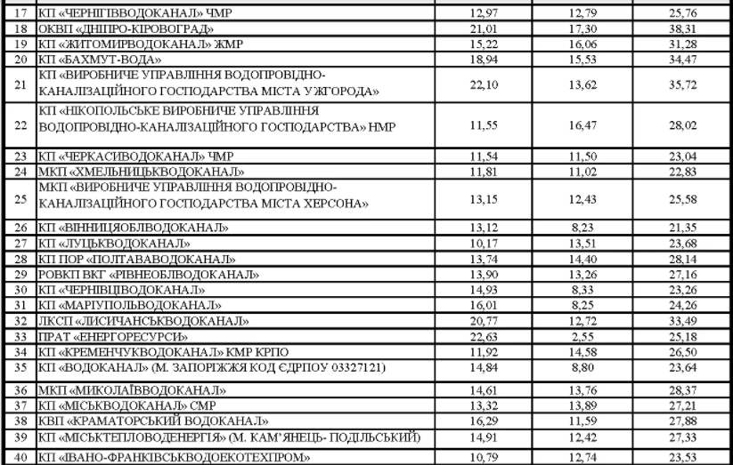 Найменше за ці послуги платять у Черкасах (21,35 грн/м³ без ПДВ – 13,12 грн/м³ та 8,23 грн/м³ за водопостачання та водовідведення відповідно) та у Львові (21,57 грн/м³ без ПДВ – 14,41 грн/м³ та 7,16 грн/м³ за водопостачання та водовідведення відповідно).
