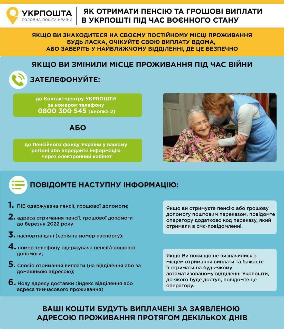 Людям, які не виїхали з місця свого постійного проживання, можуть очікувати виплати вдома або забрати у найближчому відділенні Укрпошти, де безпечно.