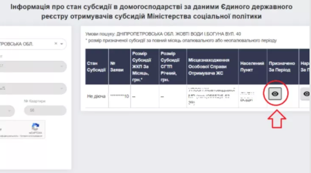 Після її натискання в першій колонці таблиці відобразиться статус субсидії. Щоб дізнатися її розмір потрібно натиснути на кнопку зі значком "ока" в колонці "Призначено за період". Сума допомоги з'явиться у спливаючому вікні. Її розмір залежить від того, чи наступив вже опалювальний сезон.