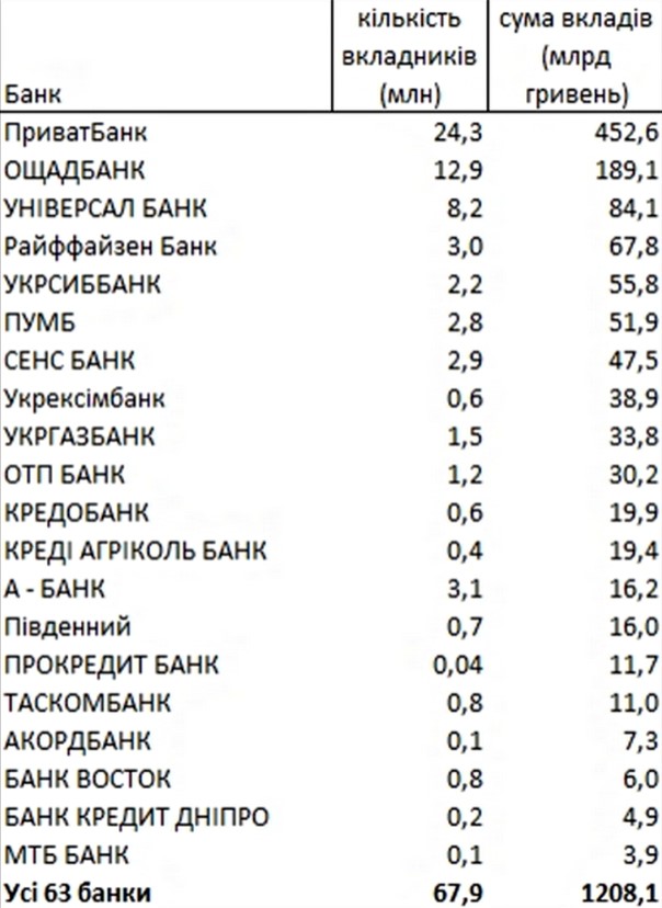 Беззаперечним лідером за обсягом депозитних рахунків став державний ПриватБанк. Ця фінустанова користується найбільшою довірою українців: щонайменше 24 мільйони громадян довірили йому близько 452,6 мільярда гривень.