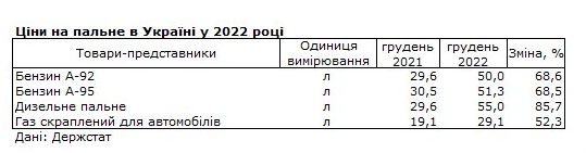 За даними відомства, дизельне паливо у 2022 році зросло у ціні на 85,7%, якщо порівнювати з розцінками за грудень 2021 року. Бензин марки А-92 подорожчав на 68,6%, а А-95 – на 68,5%.
