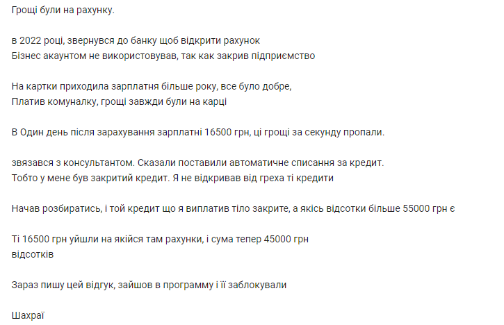 Свою розповідь він написав у відгуках на профільному порталі Мінфін.
