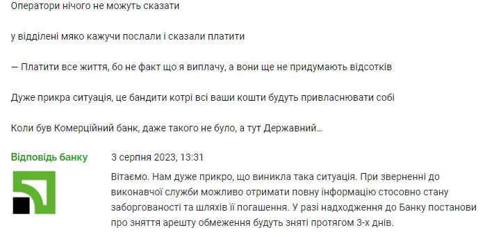 У свою чергу представники ПриватБанку відповіли канцелярською відпискою. "Нам дуже прикро, що виникла така ситуація. При зверненні до виконавчої служби можна отримати повну інформацію про стан заборгованості та шляхи її погашення. При надходженні до Банку постанови про зняття арешту обмеження буде знято протягом 3-х днів", - відгукнулися у банку.