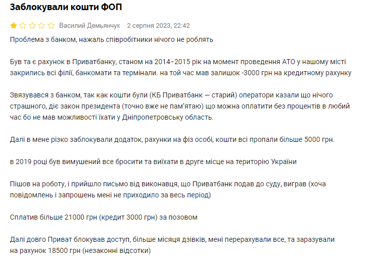 "Сплатив понад 21000 грн (кредит 3000 грн.) за позовом. Далі довго Приват блокував доступ, більше місяця дзвінків, мені перерахували всі, і зарахували на рахунок 18500 грн. (незаконні відсотки)", - розповів він.
