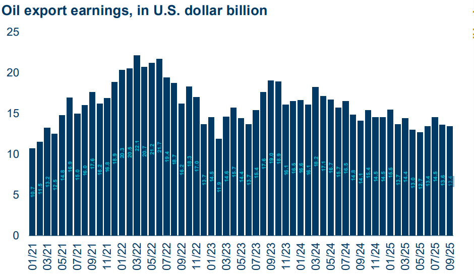 У вересні 2025 року Російська Федерація заробила на експорті сирої нафти 13,4 мільярда доларів, що на 200 мільйонів доларів менше, ніж у серпні. Це зниження відбулося на тлі збереження низьких світових цін та стабільного дисконту, а також через скорочення обсягів експорту нафтопродуктів, спричинене українськими атаками на російські нафтопереробні заводи (НПЗ).