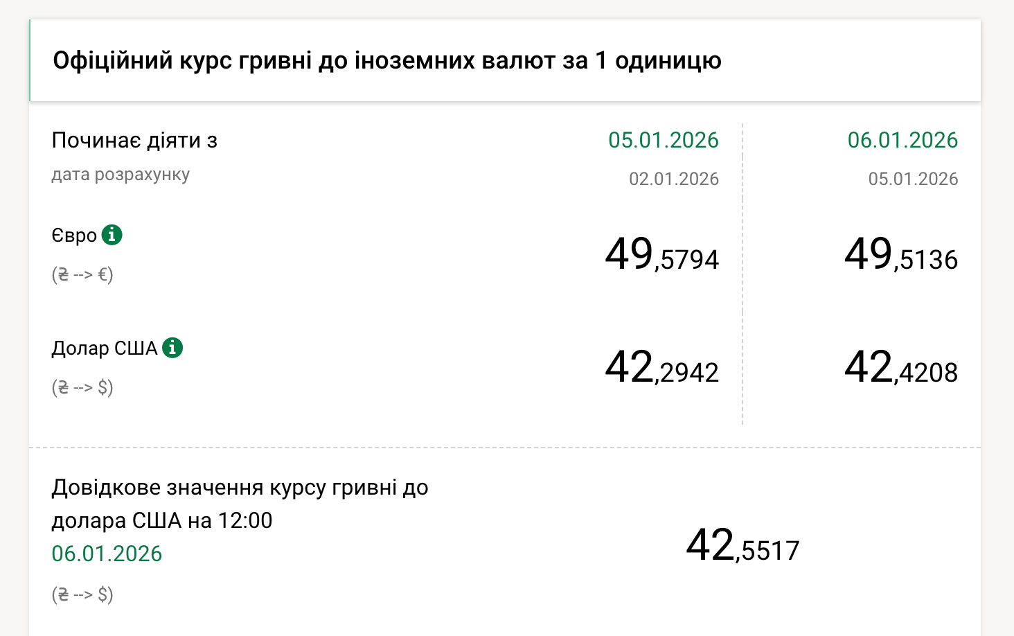 НБУ станом на 6 січня встановив курс долара на позначці в 42,42 грн, що на 13 копійок більше, ніж у понеділок, 5 січня (42,29 грн).