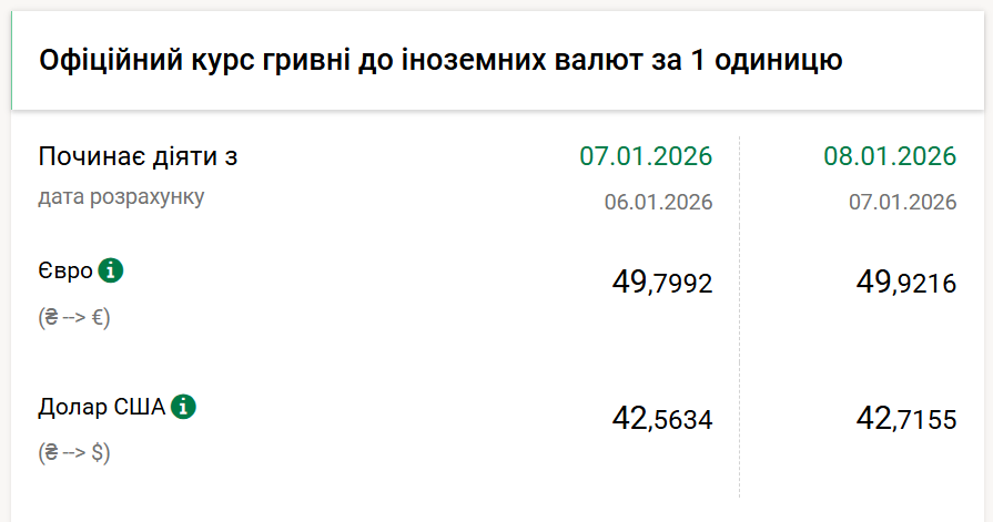 Національний банк України 7 січня підняв курс долара до 42,71, а євро до 49,92. Це є рекордним значенням.