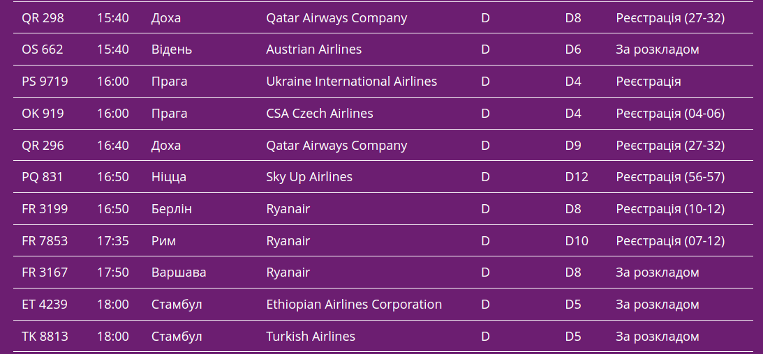 Щодо вильотів з аеропорту "Бориспіль" на понеділок, 14 лютого, було скасовано лише один - авіарейс QR 298 до столиці Катару Дохи, який здійснює авіакомпанія Qatar Airways Company. Всі інші вильоти, судячи з онлайн-табло, очікуються згідно з розкладом.