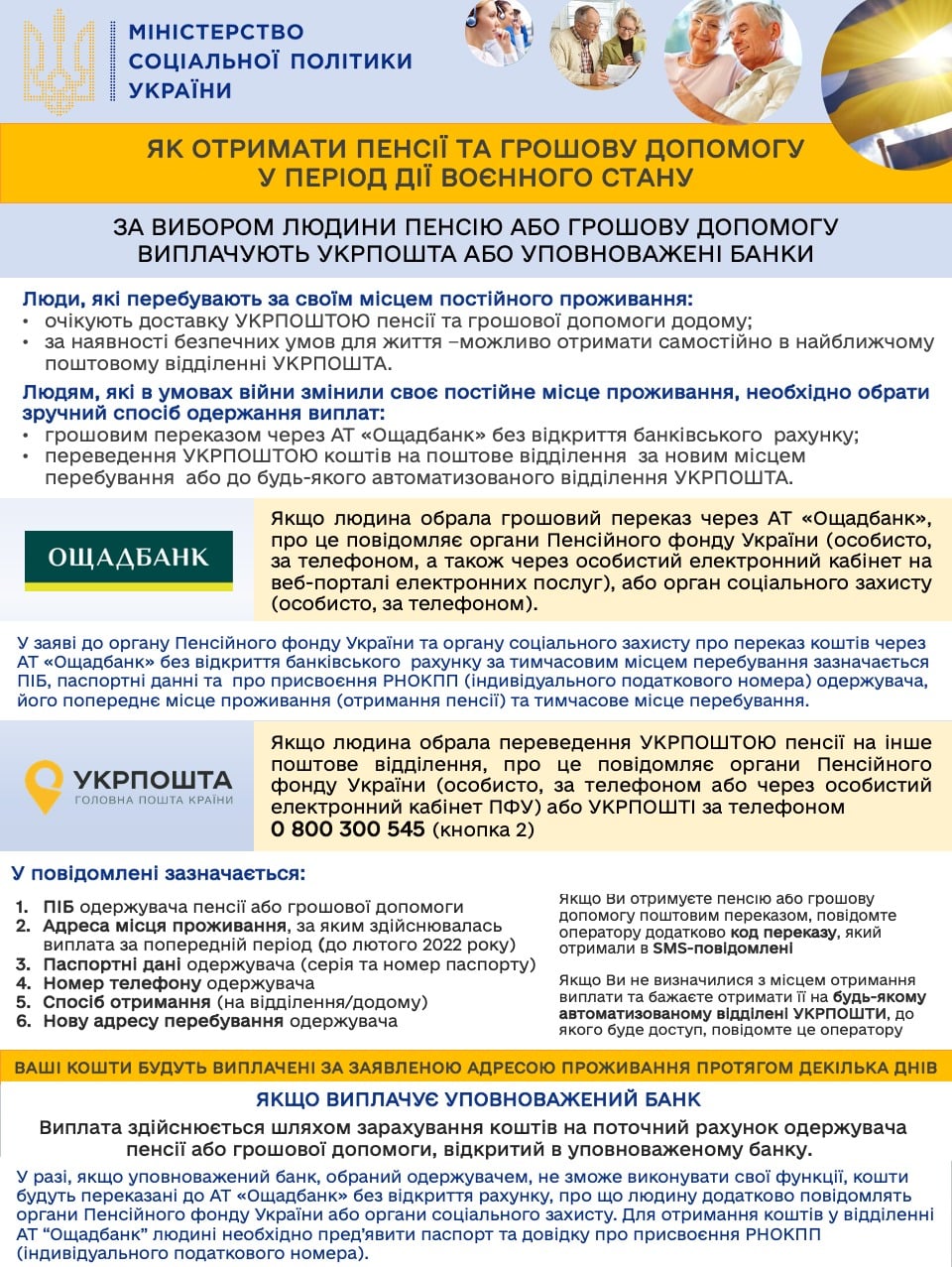 Якщо ви отримуєте пенсію/грошову допомогу поштовим переказом, повідомте оператора додатково код переказу, отриманий у SMS-повідомленні.
