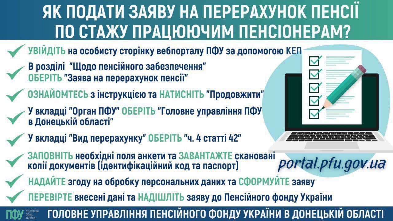 Відповідно до частини четвертої статті 42 Закону України від 09.07.2003 № 1058-IV "Про загальнообов'язкове державне пенсійне страхування", подати заяву на перерахунок пенсії за стажем працюючих пенсіонерів можна онлайн через персональний кабінет на сайті електронних послуг ПФУ.