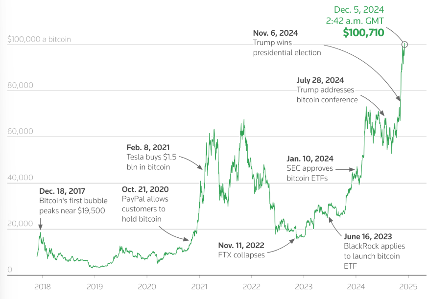 Курс Bitcoin вперше перевищив позначку в $100 000, адже інвестори зробили ставку на те, що дружня адміністрація США закріпить місце криптовалют на фінансових ринках.