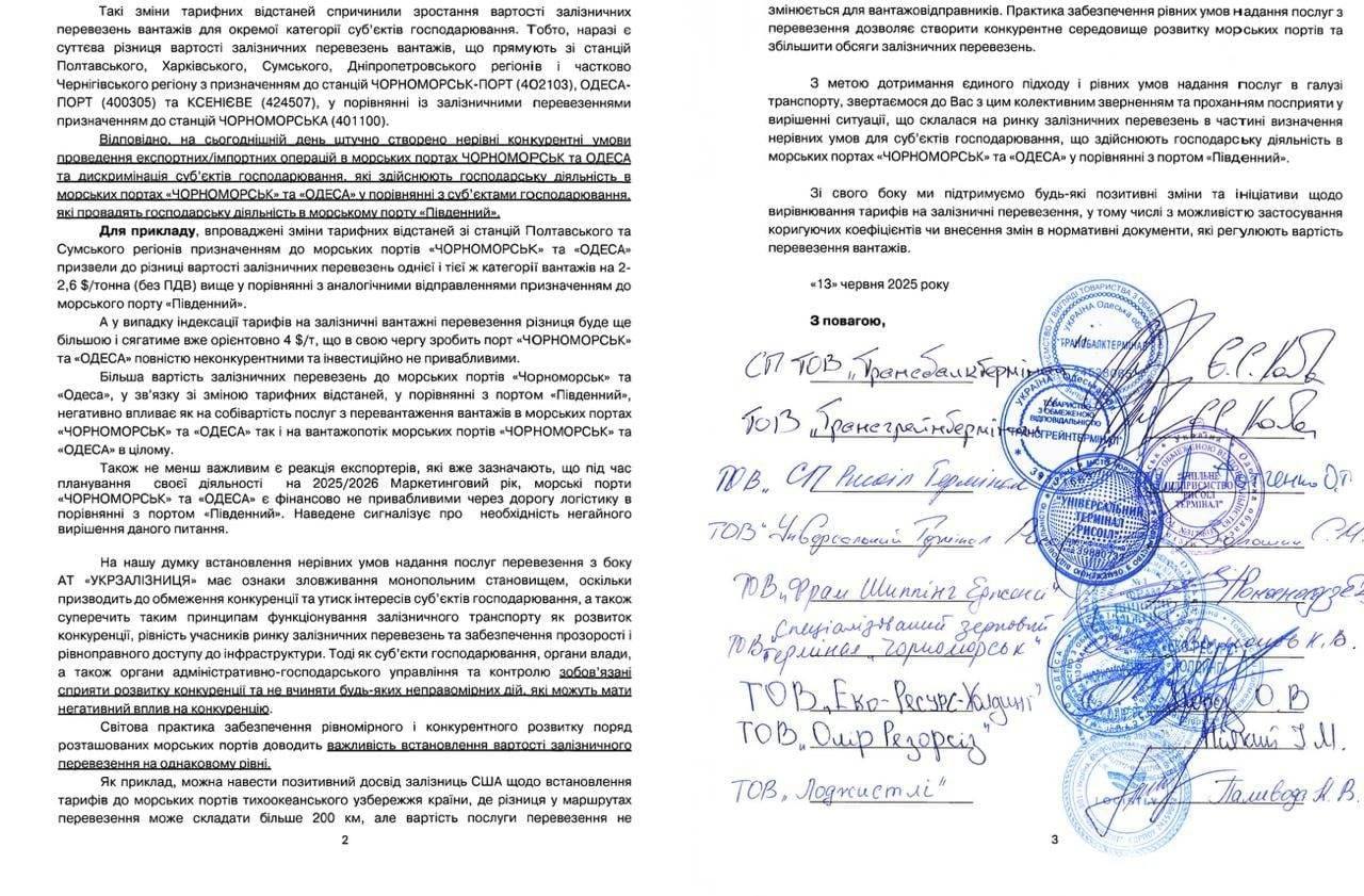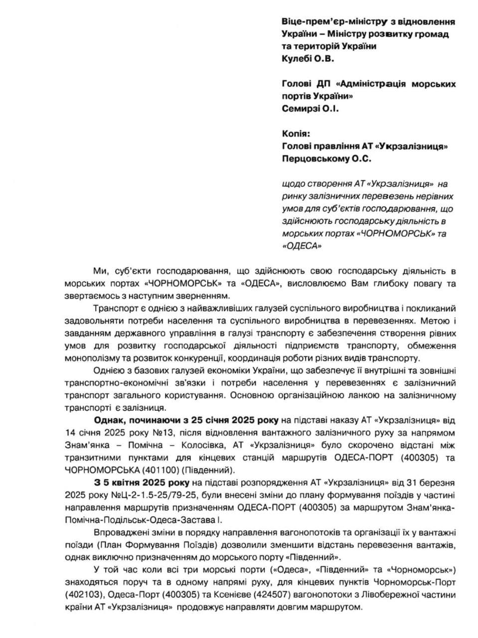 У листі акцентується, що всі три порти – Південний, Одеса та Чорноморськ – розташовані поруч. Але Укрзалізниця свідомо складає довші маршрути до Одеси і Чорноморська, і в такий спосіб штучно здорожує логістику.