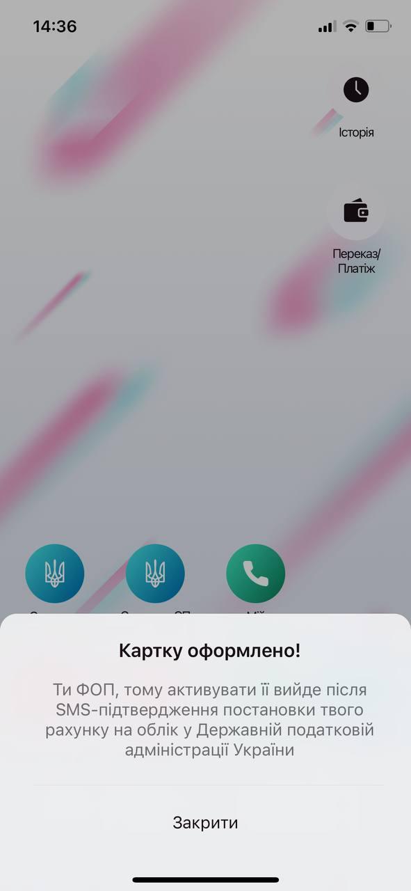 "Ти ФОП, тому активувати її вдасться після смс-підтвердження постановки твого рахунку на облік у Державній податковій адміністрації України" , - йдеться у повідомленні, яке при спробі отримати виплату отримав підприємець.
