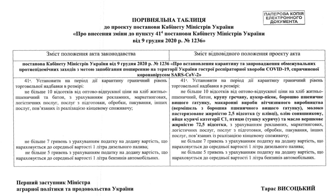 На період дії карантину гранична торгова націнка обмежена 10% на такі харчові продукти: