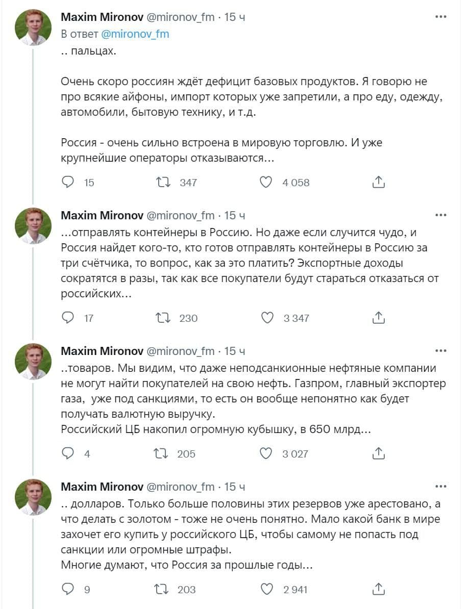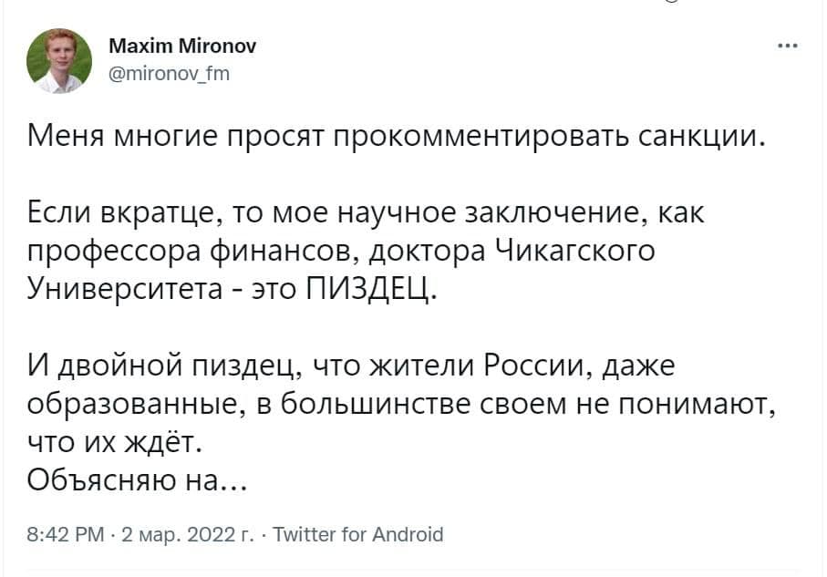 Відомий російський економіст, професор фінансів і доктор університету Чикаго Максим Миронов оцінив наслідки санкцій, введених проти Російської Федерації за військову агресію проти України. Росіяни навіть не підозрюють, що на них чекає вже найближчим часом.