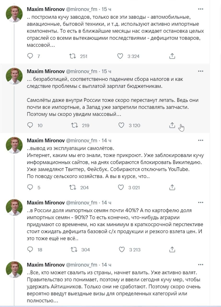 "Єдиний плюс із цієї історії, що ті, хто ностальгував за СРСР, зможуть на своїй шкурі відчути всі його принади. І це буде не щодо травоїдного СРСР за типом Хрущова-Брежнєва-Горбачова, а СРСР, на чолі якого стоїть божевільний диктатор", – резюмував Миронов.