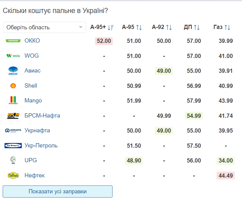 Бензин преміум-класу А-95+ продають лише на заправці ОККО за ціною 52 грн/л. Також половина з представлених заправок пропонують водіям заправитися бензином А-92 - його ціна коливається від 49 до 51 грн/л.