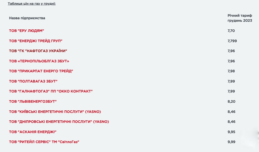 "Станом на 30 листопада тарифні пропозиції на перший місяць зими оприлюднили 12 постачальників. Порівняно з попередніми місяцями ціни на блакитне паливо знову не зміняться. Залежно від компанії, вартість кубометра газу в грудні коливатиметься від 7,70 до 9,99 грн. При цьому, у 7 постачальників ціна кубометра нижча за 8 грн, ще у 5 - вища", - йдеться в повідомленні.