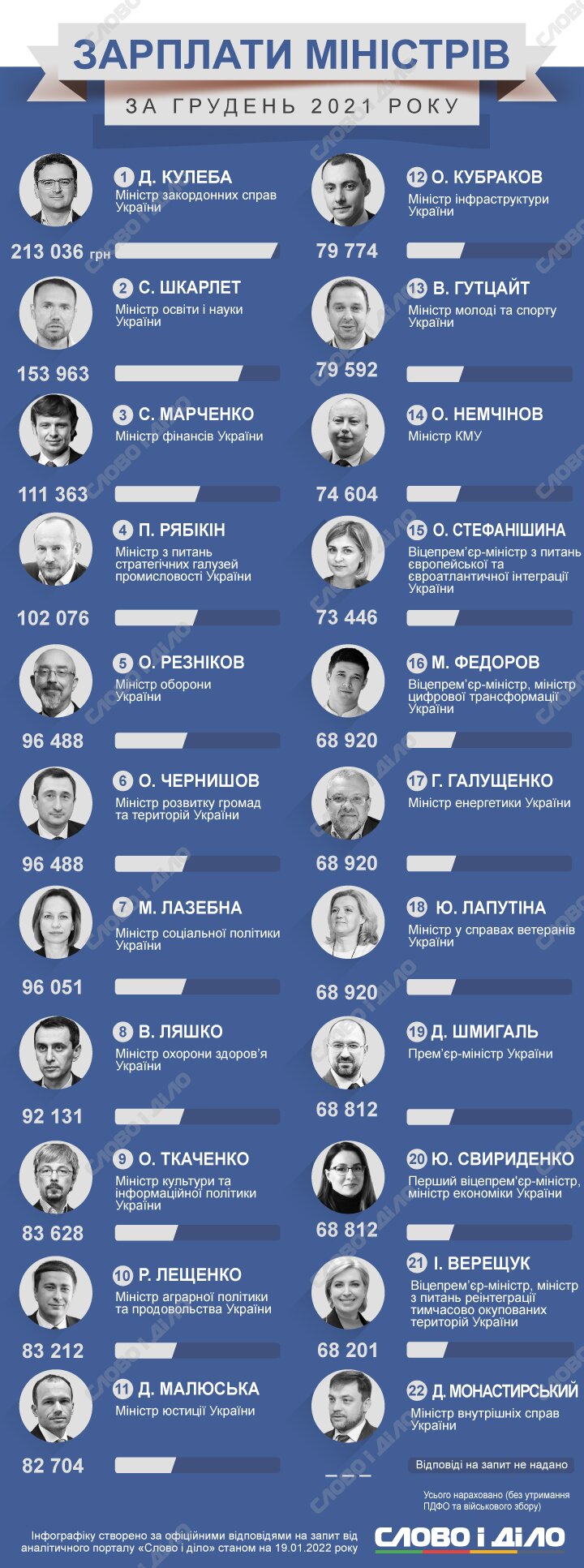 Близько 92-96 тисяч отримали Олексій Рєзніков, Олексій Чернишов, Марина Лазебна та Віктор Ляшко. Серед голів міністерств найнижча зарплата у грудні становила близько 68 тис. грн.