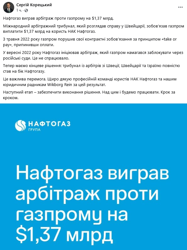 "Це важлива перемога. Щиро дякую професійній команді юристів НАК Нафтогаз та нашим юридичним радникам Wikborg Rein за цей результат", – повідомив Корецький, наголосивши, що наступним етапом має стати забезпечення виконання відповідного рішення.
