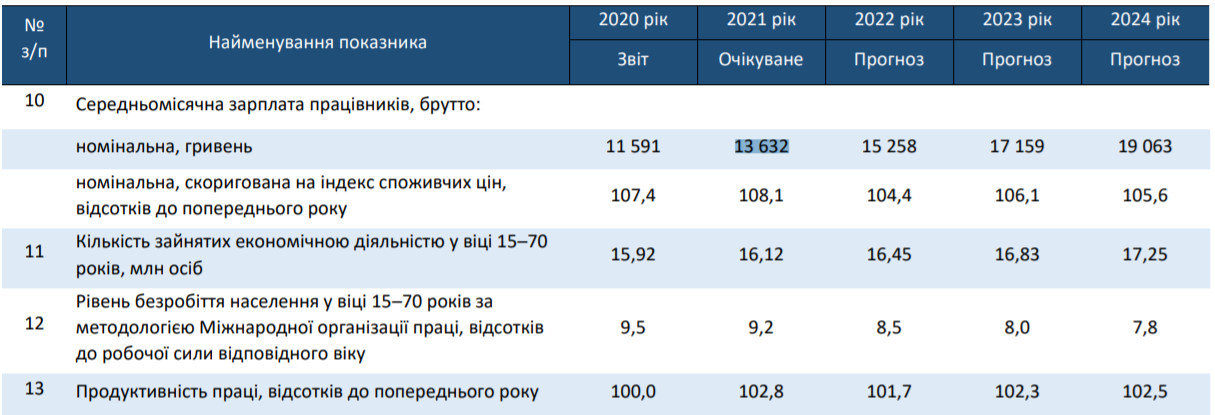Середньомісячна номінальна зарплата українців за підсумками 2021 року становитиме 13 632 грн, а до кінця 2022 вона вже зросте до 15 258. Про це йдеться в Прогнозі економічного і соціального розвитку України на 2022-2024 роки, схваленому Кабміном 31 травня 2021 року .
