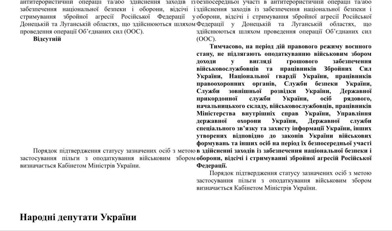 Як зазначив у Telegram політик Борислав Береза, у ВР перейнялися тим, щоб з воюючих на фронті зняти військовий збір. Тож на період війни цей податок буде скасовано для військових. Він опублікував деякі деталі законопроєкту.