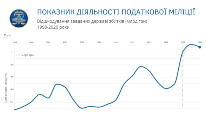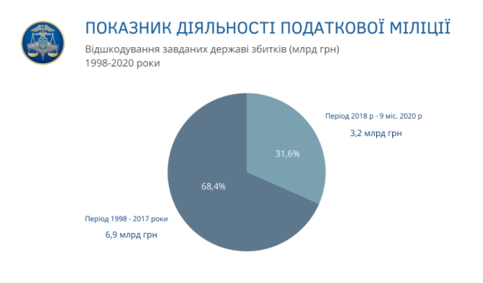 "Ще за кілька місяців до завершення календарного року, податкова міліція досягла показників 2018-2019. Рівень відшкодування завданих державі збитків у закінчених кримінальних провадженнях за 9 місяців 2020 вже перевищує 1 мільярд гривень. Роком раніше, за аналогічний період, державі було відшкодовано 587 млн. Тобто, ефективність відшкодування збитків збільшилась вдвічі", – зазначив керівник служби.
