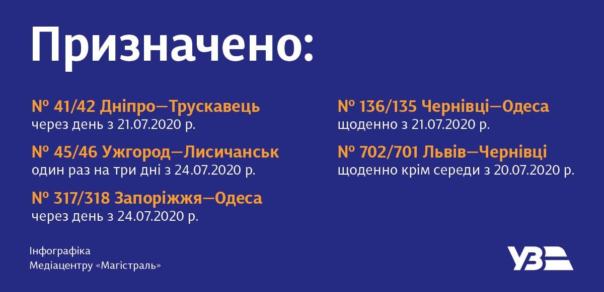 Поїзд № 41/42 Дніпро - Трускавець відправиться з Дніпра 21 липня, з Трускавця - 22 липня. Поїзд курсуватиме через день.