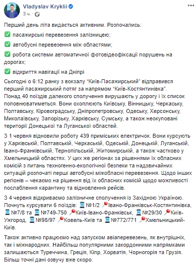 Крім того з 1 червня відновили роботу 439 приміських електричок. Вони курсують в Харківській, Полтавській, Черкаській, Одеській, Донецькій, Луганській, Івано-Франківській, Тернопільській, Житомирській, а також частково в Хмельницькій областях. У цих регіонах за рішеннями їх обласних комісій з питань техногенно-екологічної безпеки та надзвичайних ситуацій розпочато перші автобусні міжобласні перевезення.