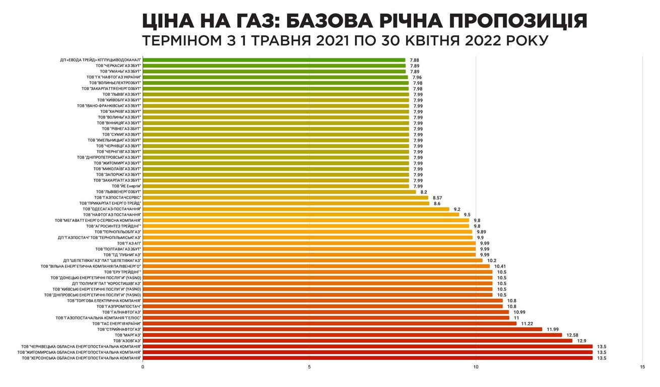 Ціну 7,88 грн за кубометр запропонувало ДП "Евода трейд"КП "Луцькводоканал", 7,89 грн - ТОВ "Черкасигаз збут"і ТОВ "Уманьгаз збут", 7,96 грн – Газопостачальна компанія "Нафтогаз України".