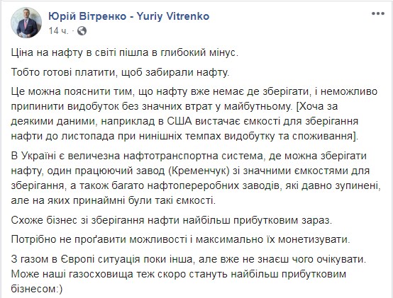 "Ціна на нафту в світі пішла в глибокий мінус. Тобто готові платити, щоб забирали нафту. В Україні є величезна нафтотранспортна система, де можна зберігати нафту, один працюючий завод (Кременчук) зі значними ємностями для зберігання, а також багато нафтопереробних заводів, які давно зупинено, але на яких, все ж таки, були такі ємності", - стверджує він.