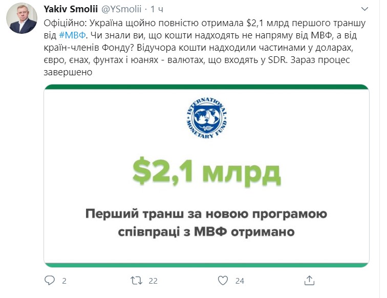 "Чи знали ви, що кошти надходять не напряму від МВФ, а від країн-членів Фонду? Відучора (тобто з 11 червня - "Апостроф") кошти надходили частинами у доларах, євро, єнах, фунтах і юанях - валютах, що входять у SDR (спеціальні права запозичень, міжнародний резервний актив МВФ, у якому він проводить розрахунки - "Апостроф"). Зараз процес завершено", - додав він.