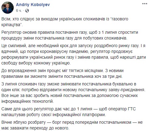Коболєв пояснив, що до цього процес зміни постачальника газу міг тягнутися місяцями, тоді як після початку роботи нових правил постачальника можна буде змінити за кілька днів.