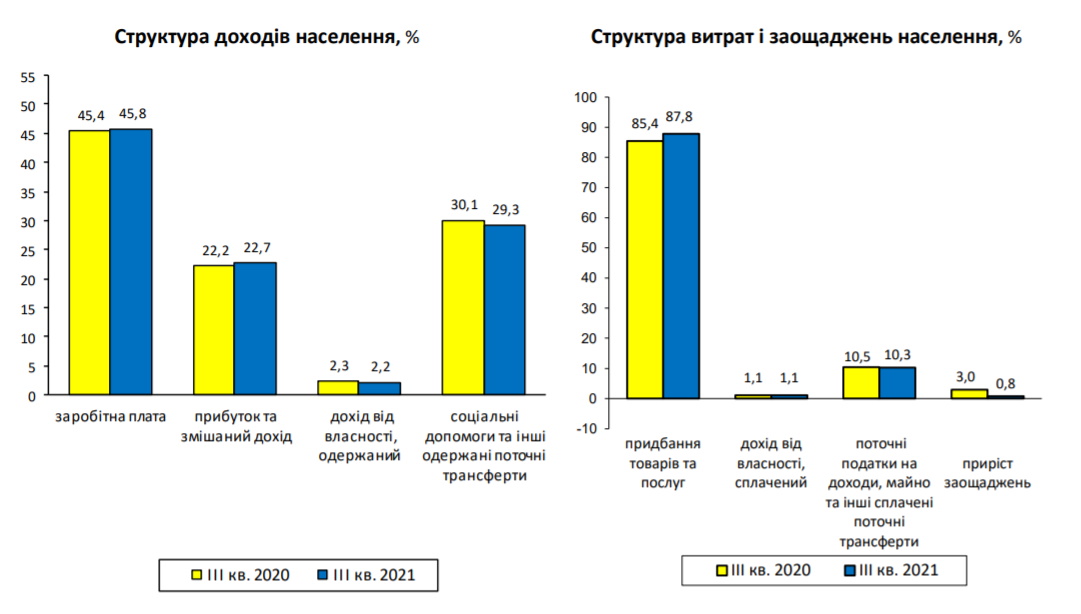 За даними статистики, у цей період доходи населення України склали 1221,8 млрд гривень, витрати - 1212,4 млрд гривень, а заощадження українців зросли на 9,4 млрд гривень. Зазначається, що, порівняно з аналогічними даними за III квартал 2020 року, номінальні доходи населення зросли на 18,7%.