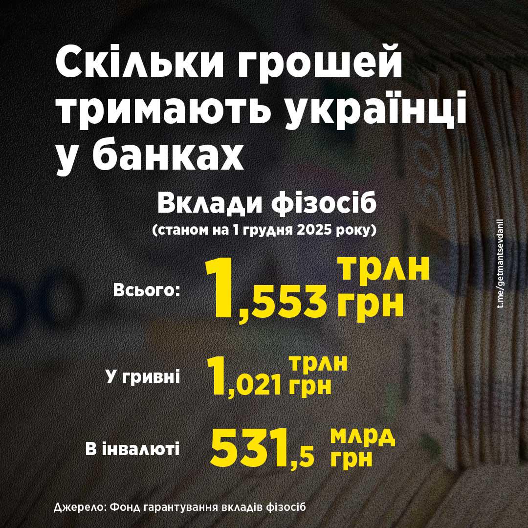 Станом на 1 грудня 2025 року загальна сума заощаджень громадян в українських банках сягнула 1,553 трлн грн. Протягом останнього року обсяг вкладів населення збільшився на 206 млрд грн, що становить 15,3% зростання. Більшу частину коштів українці зберігають у національній валюті, надаючи перевагу рахункам "до запитання".