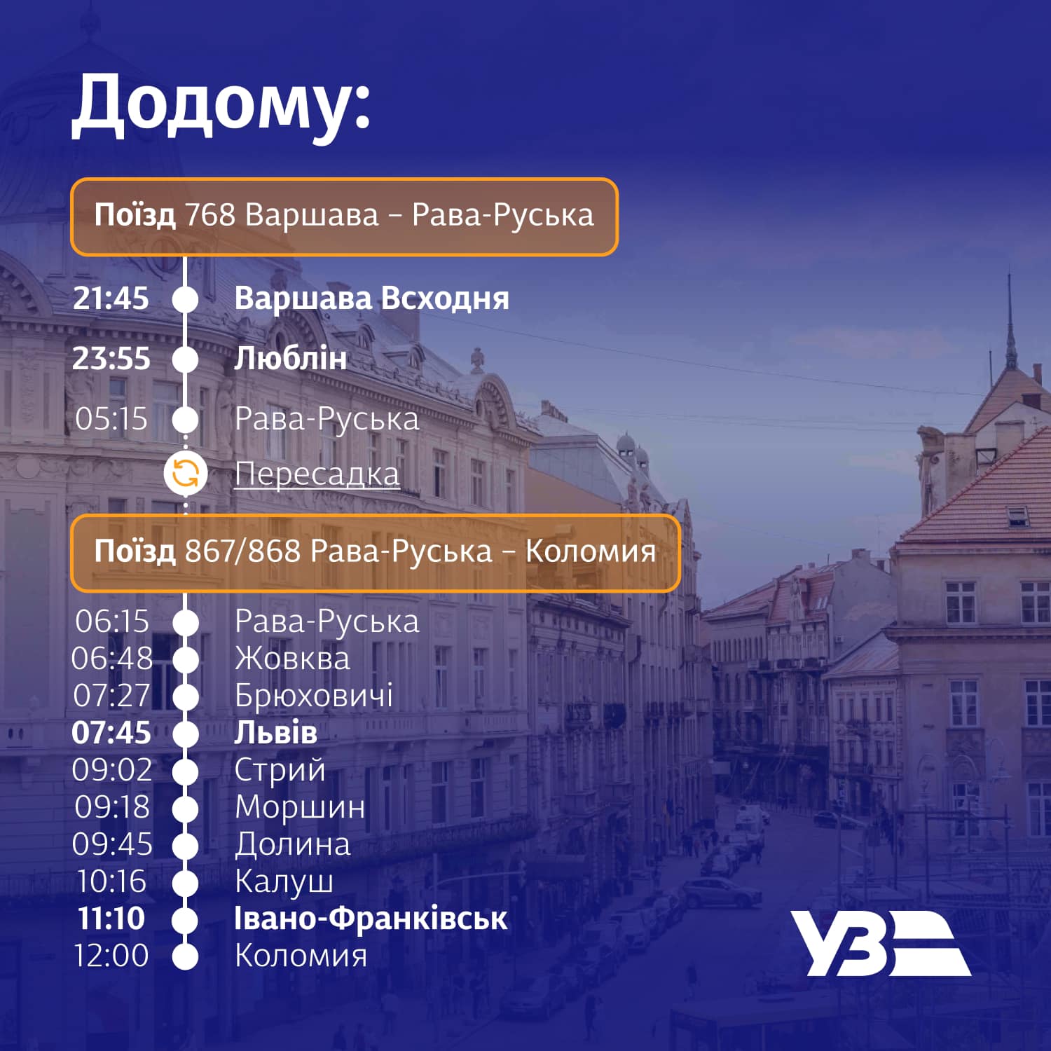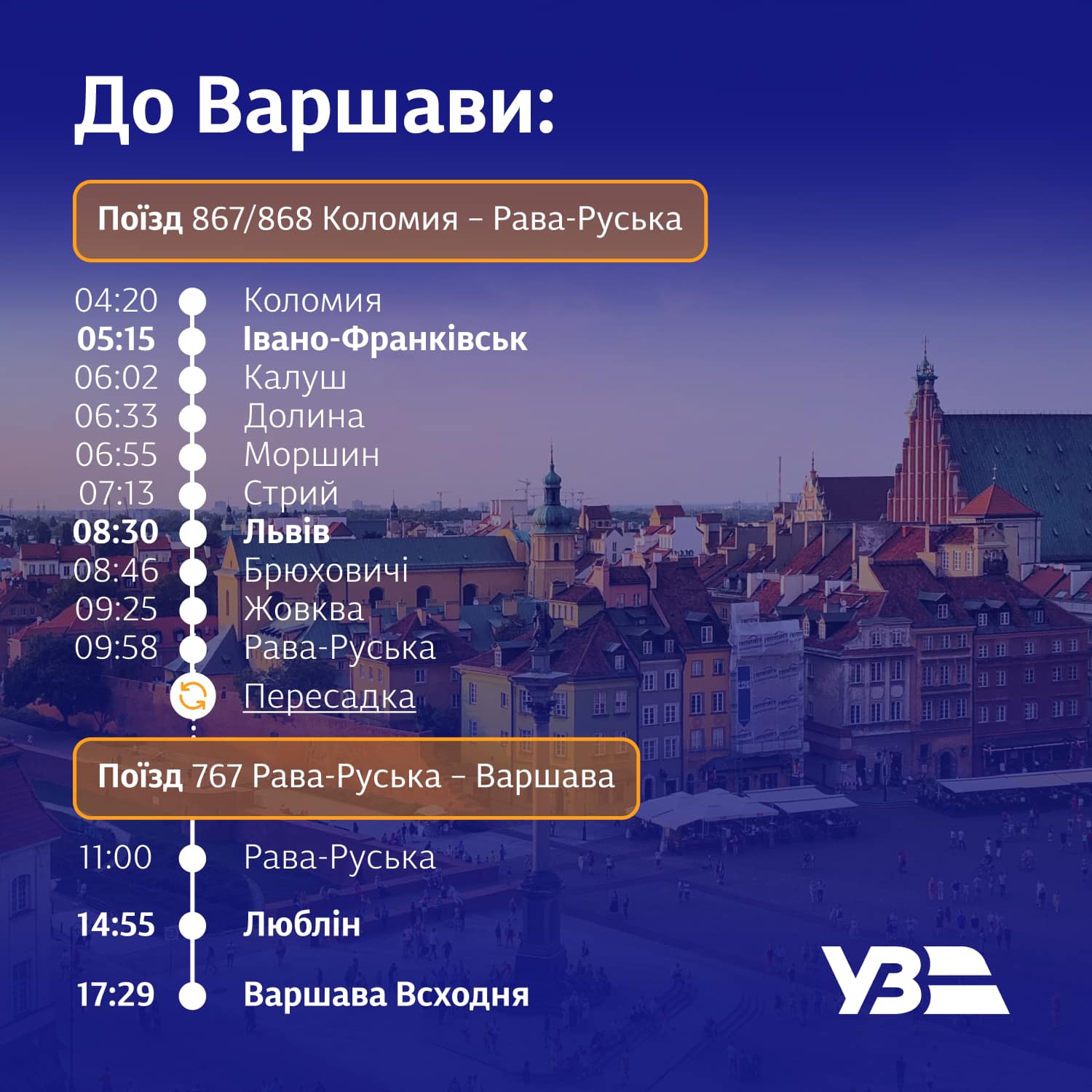 "До Рави-Руської пасажирів зі Львова, Івано-Франківська, Стрия, Коломиї, Калуша, Брюховичів та Жовкви везе по колії ширини 1520 мм сучасний дизель-поїзд українського виробництва з доступом до Wi-Fi через Starlink. На станції Рава-Руська пасажири здійснюють пересадку на поїзд польського перевізника SKPL європейської колії (1435 мм) і можуть доїхати до Любліна або Варшави", - йдеться у повідомленні компанії.