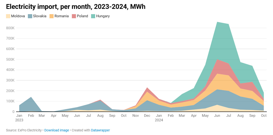 Видання вказує, що найбільше електроенергії у жовтні імпортували з Угорщини - 32,8% від загального обсягу.